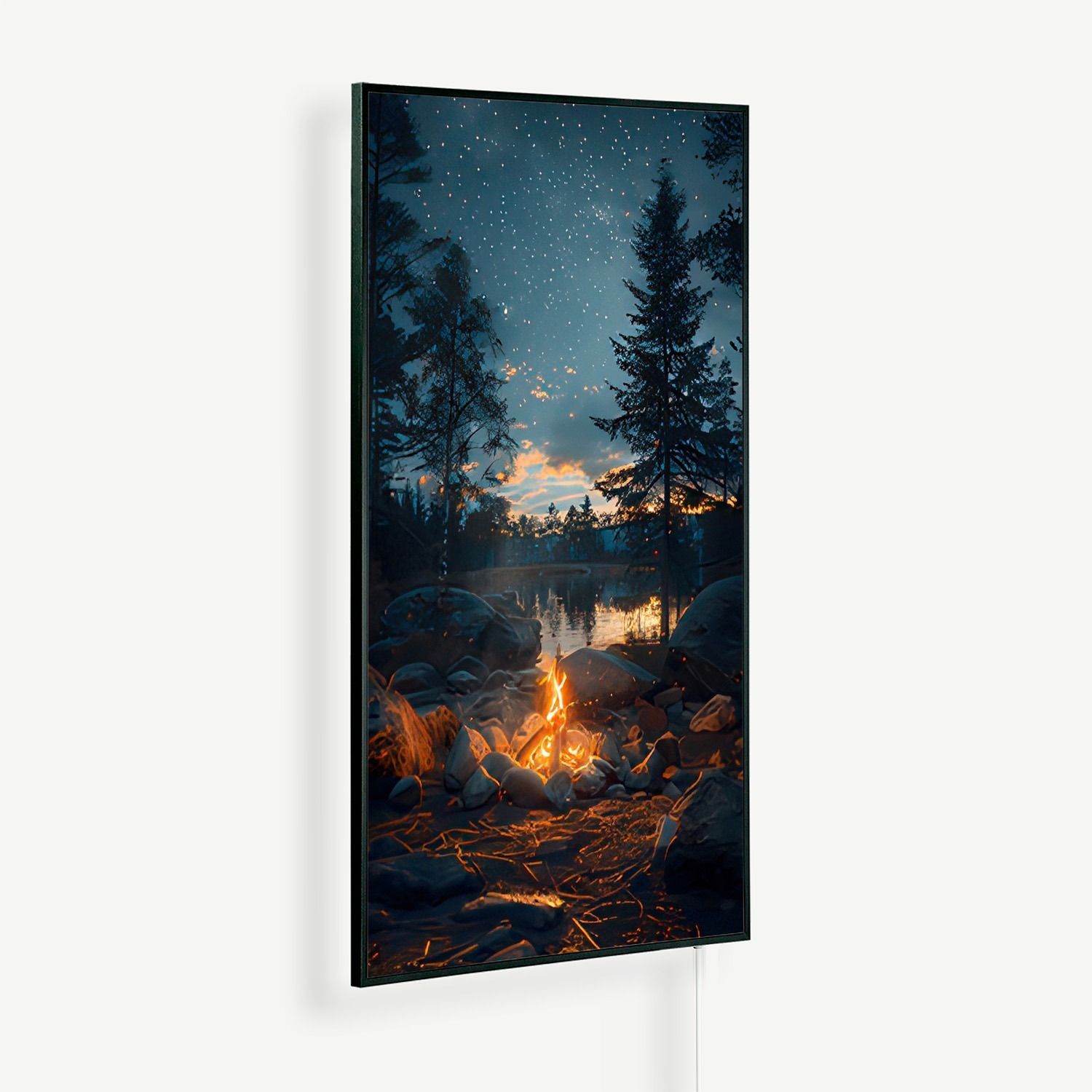 Kampvuur bij meer in het bos | Witte of zwarte lijst | 450 Watt – 1200 Watt
