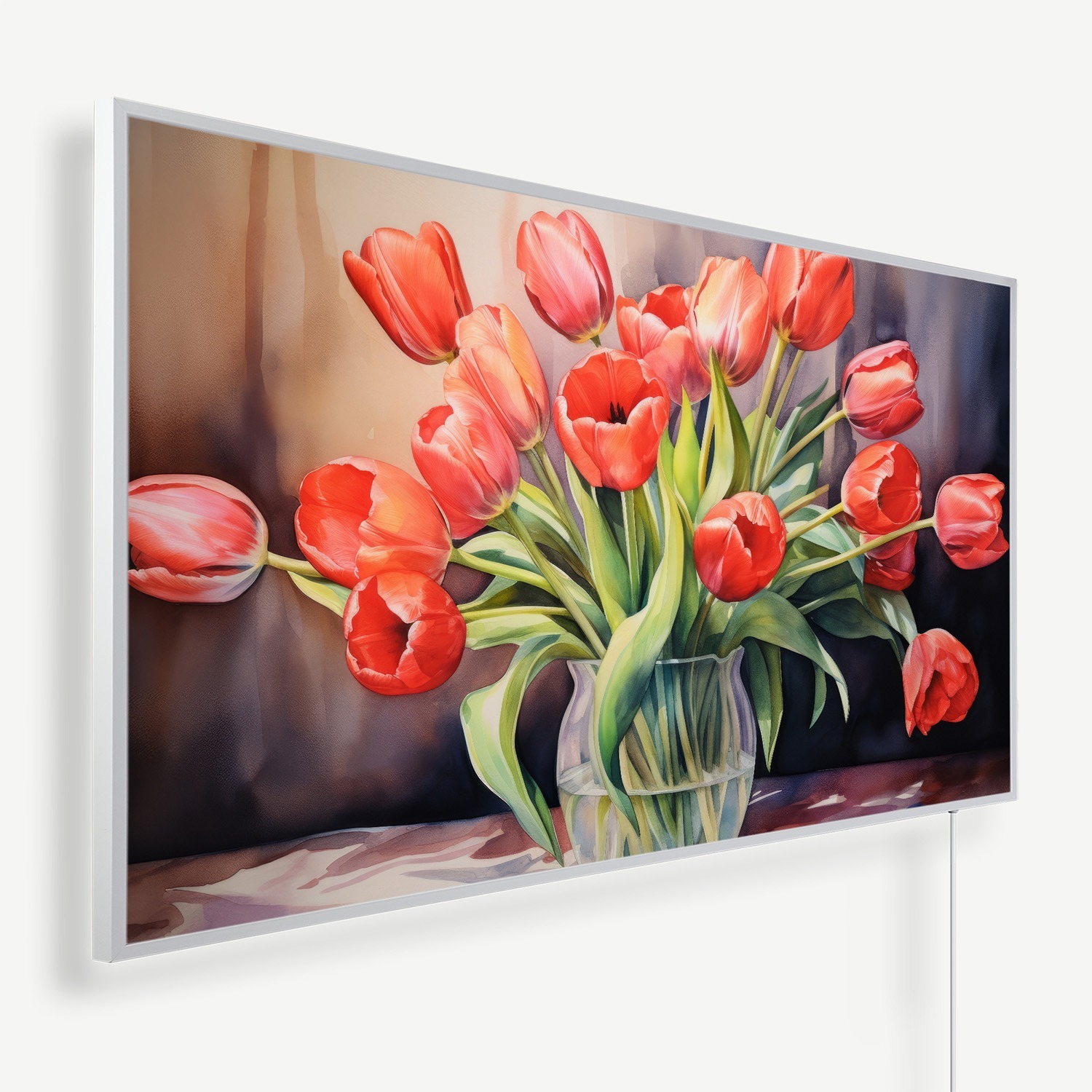 Rode tulpen in een vaas aquarel | Witte of zwarte lijst | 450 Watt – 1200 Watt