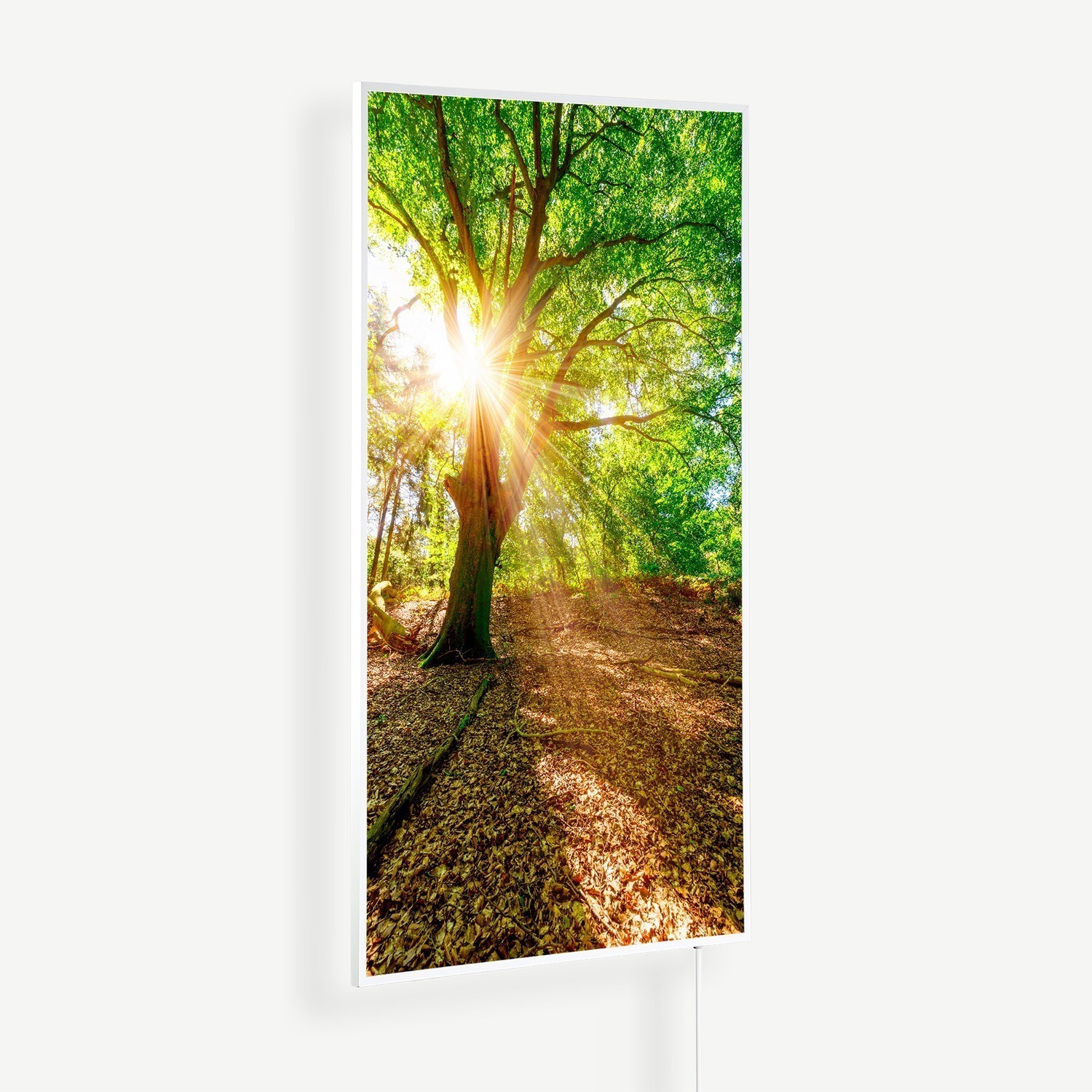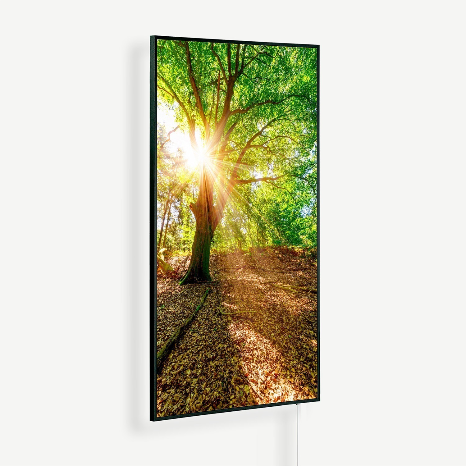 Zon schijnt door boom in bos | Witte of zwarte lijst | 450 Watt – 1200 Watt